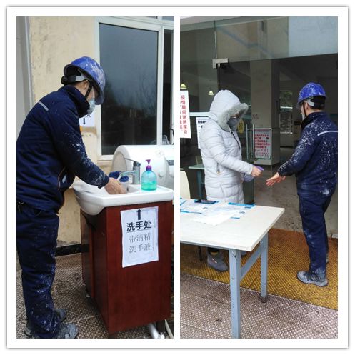 指挥部每天对办公、生产和宿舍等人员密集的区域进行两次消毒,食堂要求进行三次消毒。所有人员必须佩戴口罩,并在党员志愿者的监督下完成洗手、酒精消毒方可进入食堂,食堂饭菜全部使用饭盒打包带走,避免集中就餐。